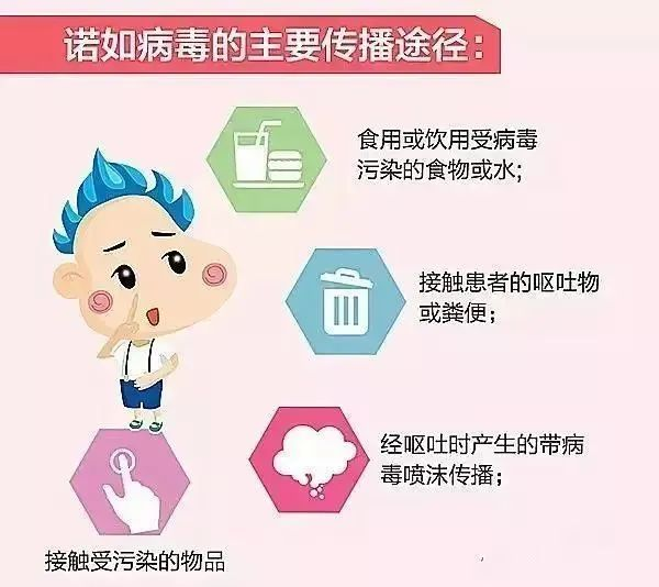 诺如病毒传播途径包括人际传播、经食物和经水传播。人传人可通过粪-口途径(包括摄入粪便或呕吐物产生的气溶胶)、或间接接触被污染的环境而传播。食物传播是通过食用被污染的食物导致传播,经水传播则是由于饮用水源被污染所致。