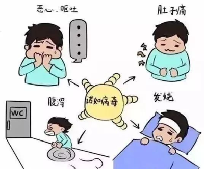 常见症状主要为恶心、呕吐、发热、腹痛和腹泻,部分患者有头痛、畏寒和肌肉酸痛等。儿童以呕吐为主,成人则腹泻居多,24h内腹泻几次到数十次不等,粪便为稀水便或水样便,无粘液脓血。有些感染者仅表现出呕吐症状。此外,也可见头痛、寒颤和肌肉痛等症状。婴幼儿、老年人等免疫功能低下的人群感染诺如病毒后,一般症状较重,持续时间较长,容易发生严重脱水,甚至导致死亡等严重后果。
