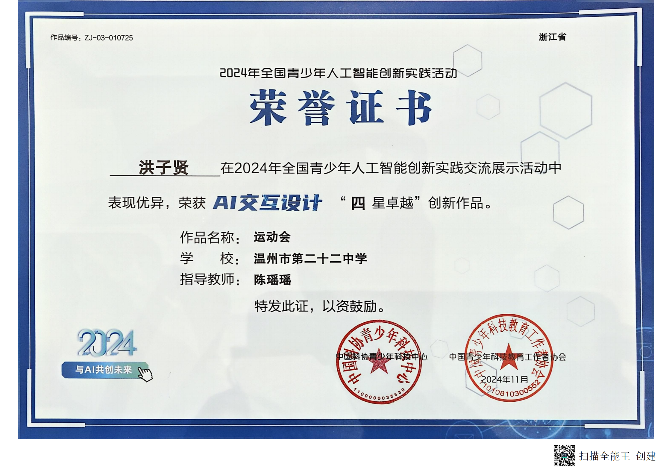 今年我校高一(14)班戴承沿、洪子贤、毕逸凡三位同学分别制作的《元宵谜趣》、《运动会》、《龙舟竞速》也均在2024年全国青少年人工智能创新实践交流展示活动中获得“四星卓越”称号。