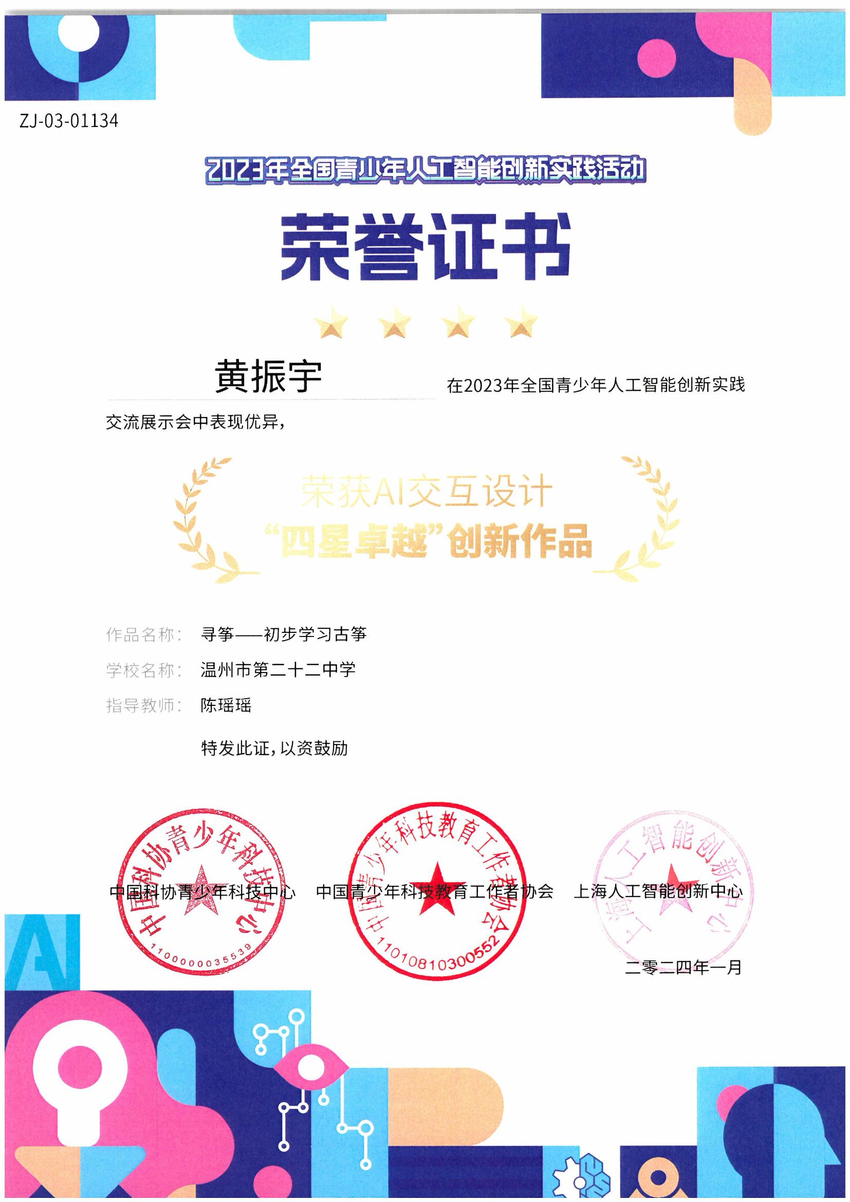 黄振宇同学2023年曾参加“与AI共创未来”全国青少年人工智能创新实践活动,他的AI交互项目《寻筝》获得“四星卓越”人工智能作品,其通过结合古筝元素和AI技术,让更多人了解古筝这一中国传统乐器和AI在生活中的广泛应用,为传统文化的传承和发展提供了新的路径。