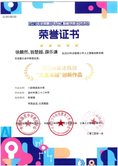 徐麟然、翁楚越、薛乐谦三位同学合作的”八段锦姿态分类”项目,在2023年“与AI共创未来”全国青少年人工智能创新实践活动中的AI算法挑战赛上获得“五星卓越”称号,其采用图像识别技术,利用卷积神经网络(CNN),通过深度学习训练,使AI能够识别八段锦动作的不同姿态。