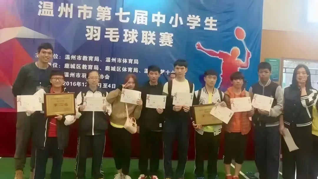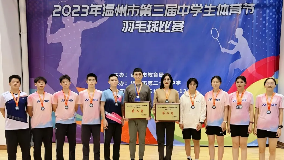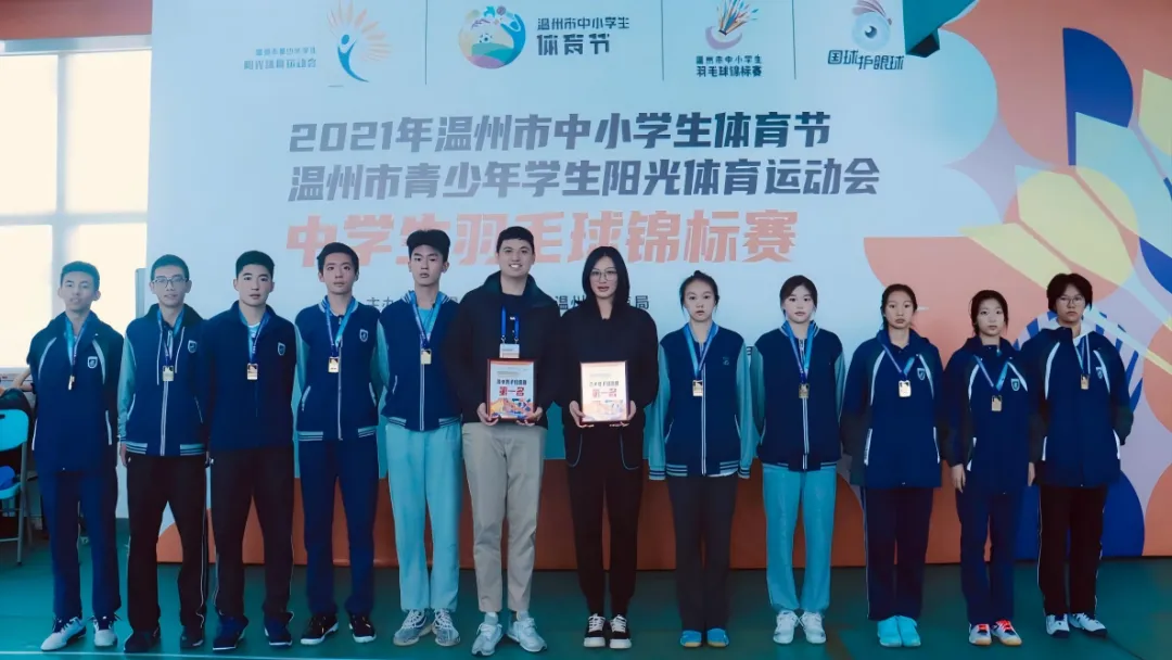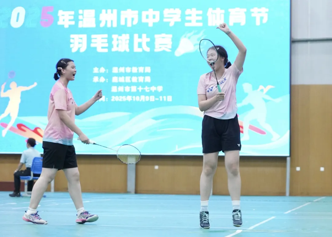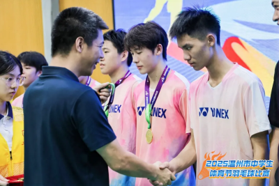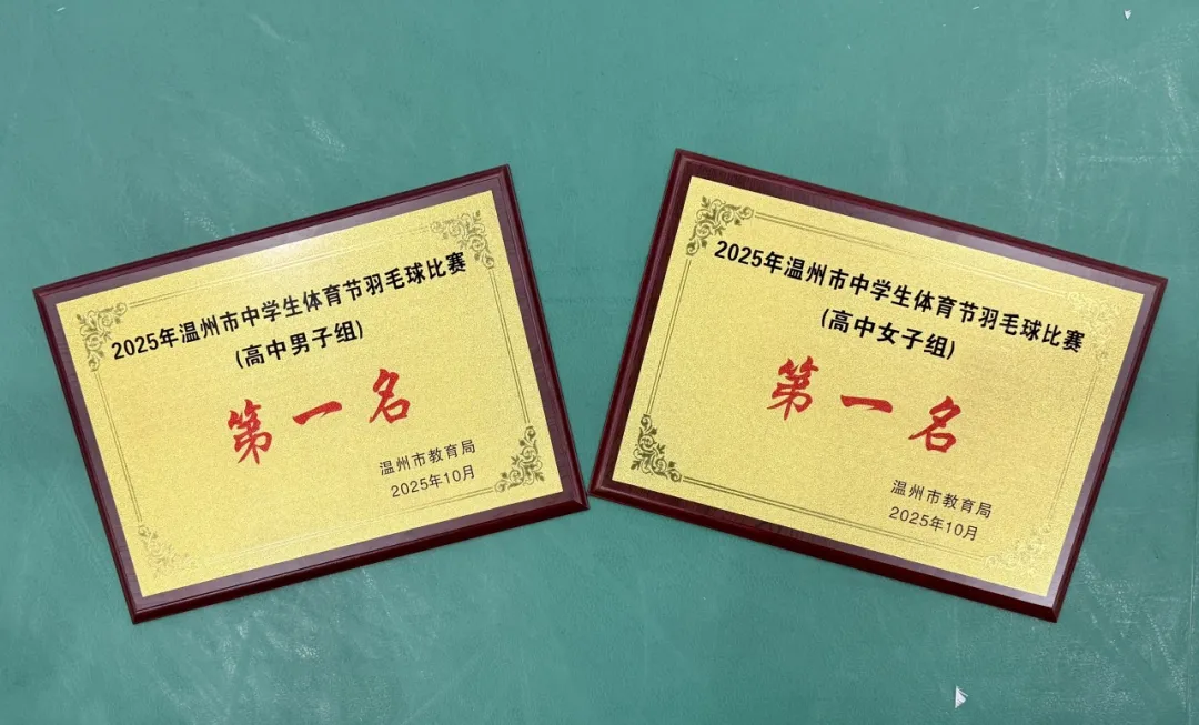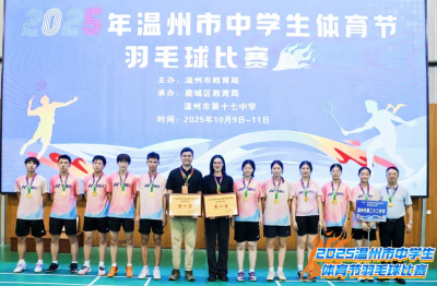 2025年10月9日至11日,2025年温州市中学生体育节羽毛球比赛在温州十七中举行。在温新炜老师和金燕老师的悉心指导下,校羽毛球队员在比赛中展现出卓越的竞技水平和顽强的拼搏精神。队员们凭借精准的落点控制、凌厉的进攻节奏以及默契的团队配合,一路过关斩将,一举夺得2025年温州市中学生体育节羽毛球比赛高中男子组与女子组团体冠军!
