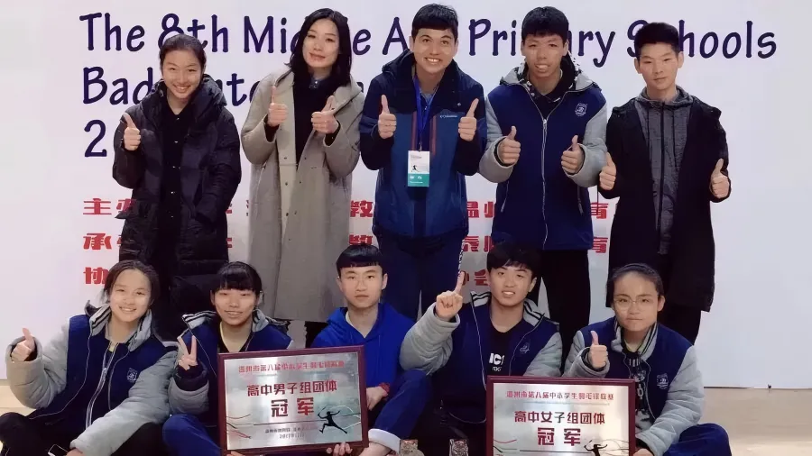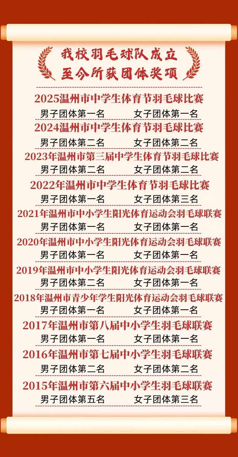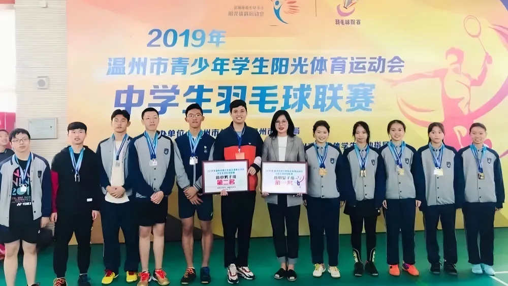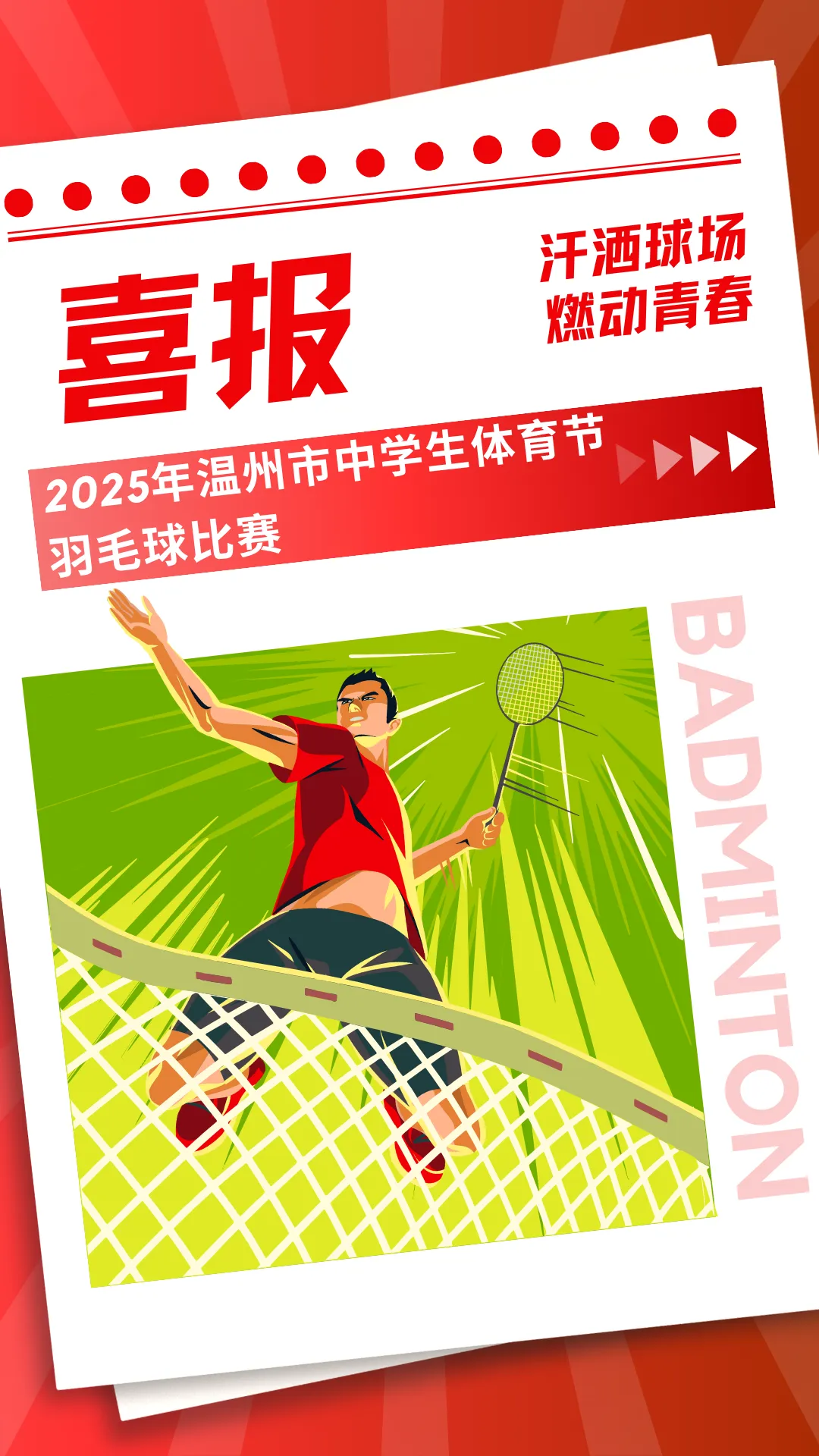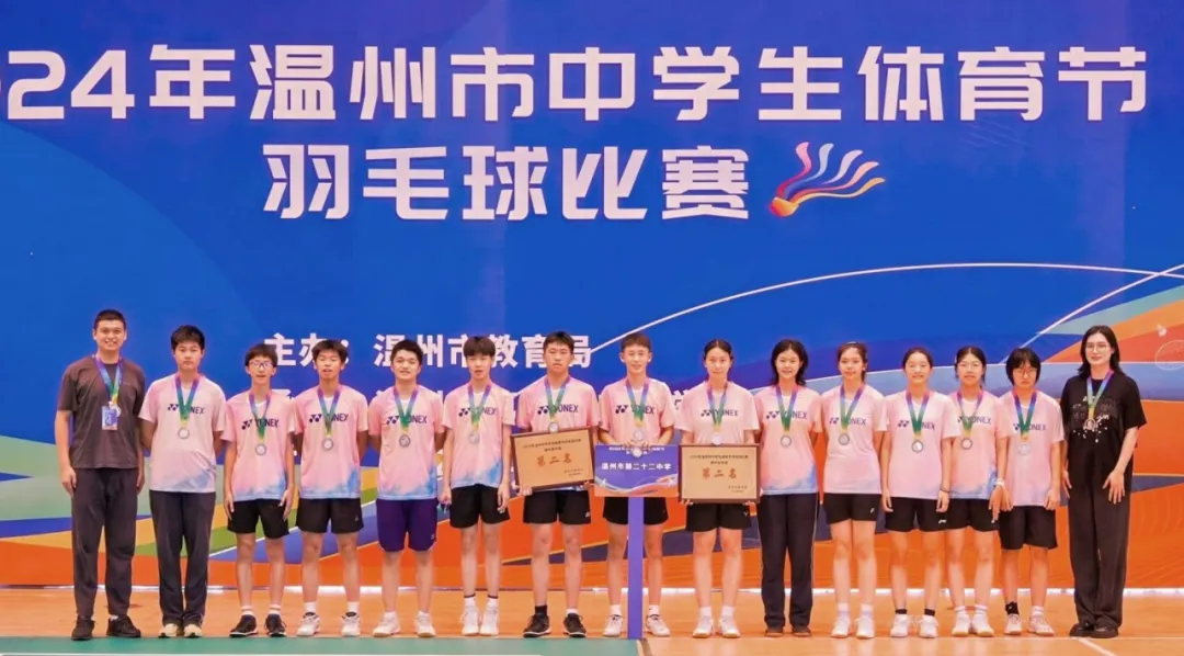 2025年10月9日至11日,2025年温州市中学生体育节羽毛球比赛在温州十七中举行。在温新炜老师和金燕老师的悉心指导下,校羽毛球队员在比赛中展现出卓越的竞技水平和顽强的拼搏精神。队员们凭借精准的落点控制、凌厉的进攻节奏以及默契的团队配合,一路过关斩将,一举夺得2025年温州市中学生体育节羽毛球比赛高中男子组与女子组团体冠军!