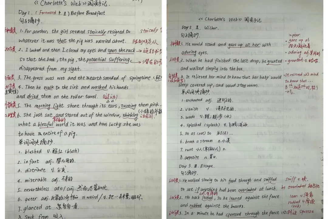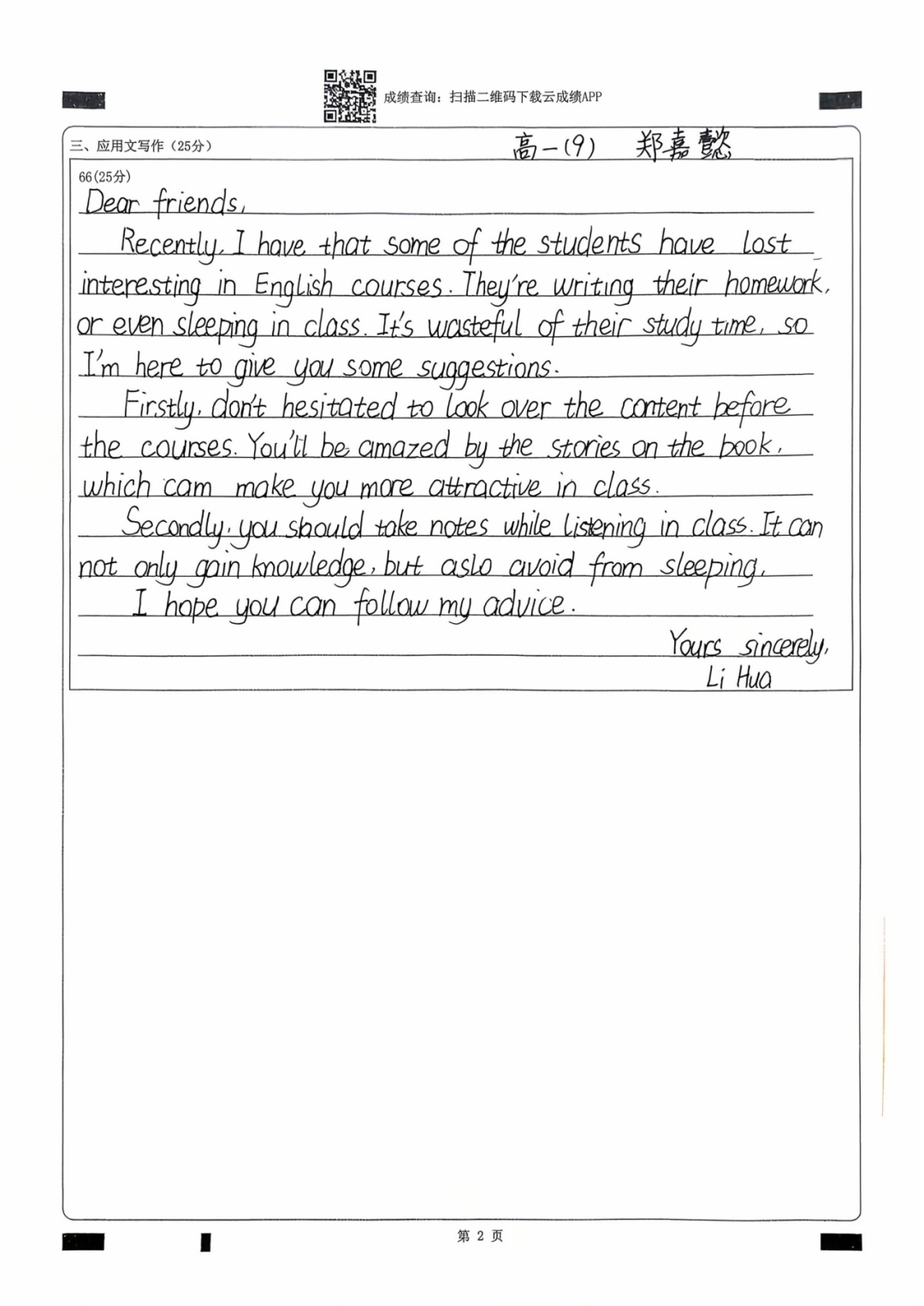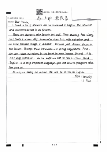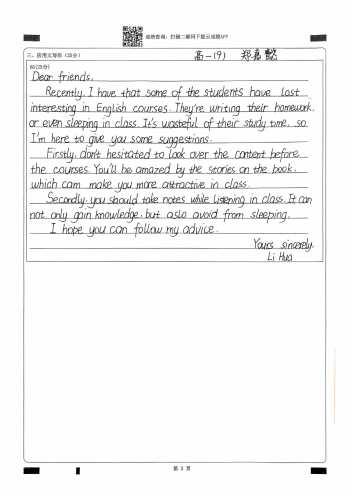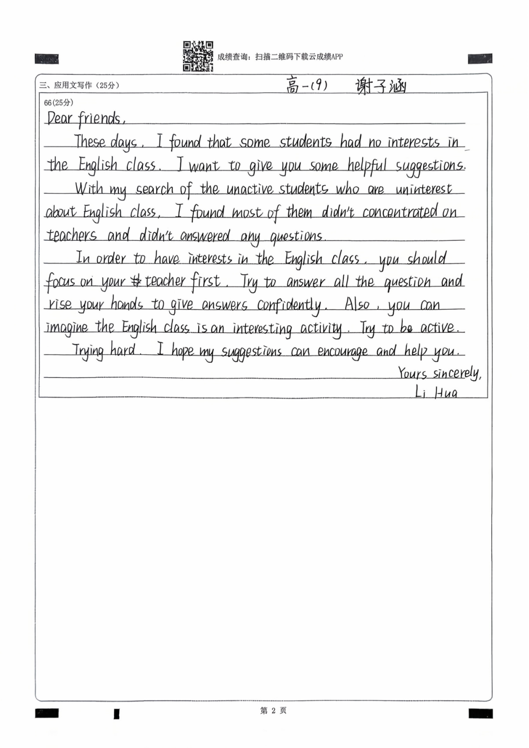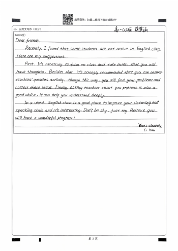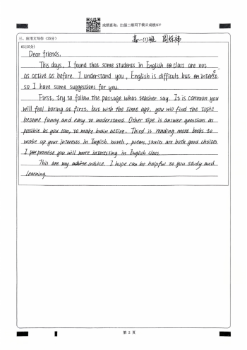 经过英语组老师们从字母书写规范、单词间距、篇章布局、卷面整洁度等多个维度的严格评审,一大批优秀作品脱颖而出。这些作品是同学们在有限的时间里、紧张的情绪中所展示的书写状态,也许做不到完美无瑕,却真正赢得了阅卷老师们的芳心。让我们期待在下一次的考场,能诞生更多更优秀的作品。