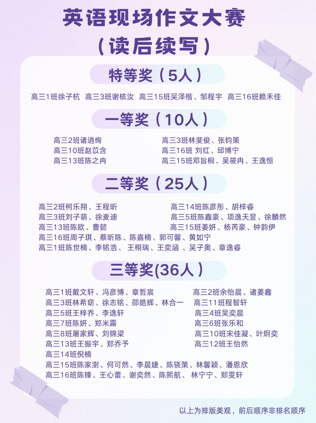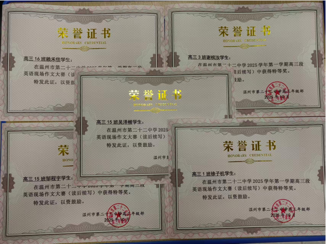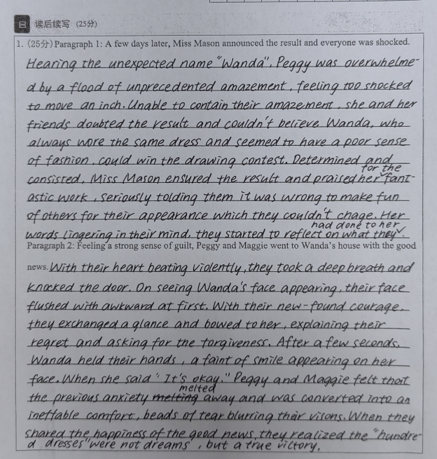 评委张老师点评道:“我们欣喜地看到,许多同学不仅写出了语法正确的句子,更写出了直抵人心的段落。他们笔下的故事,有的着眼于跨越文化与隔阂的理解,有的歌颂了平凡人之间最朴素的爱与理解。这充分说明,语言学习最终的目标是传递思想与情感,是进行有温度、有深度的交流。这次比赛,无疑是对学生心灵的一次温柔抚慰,也是对高考应试能力的一次扎实提升。”