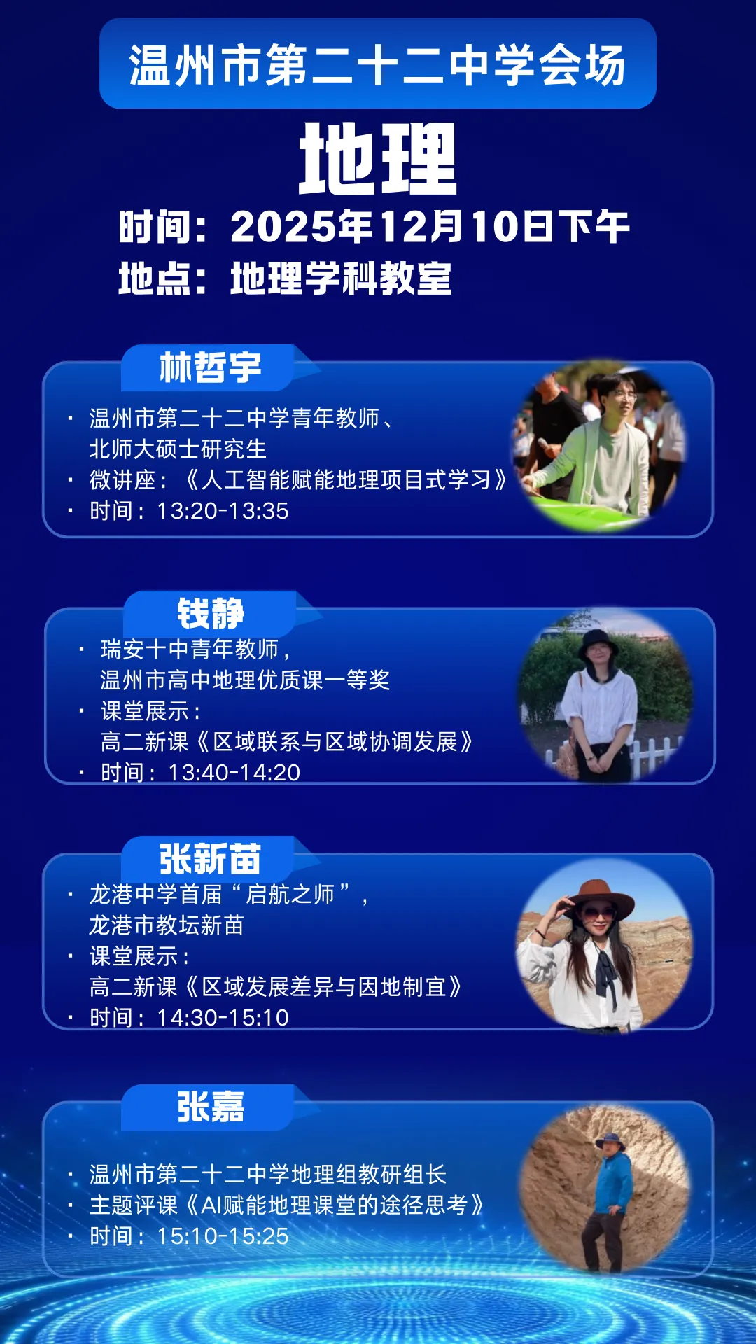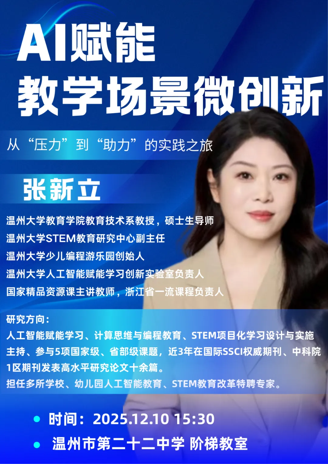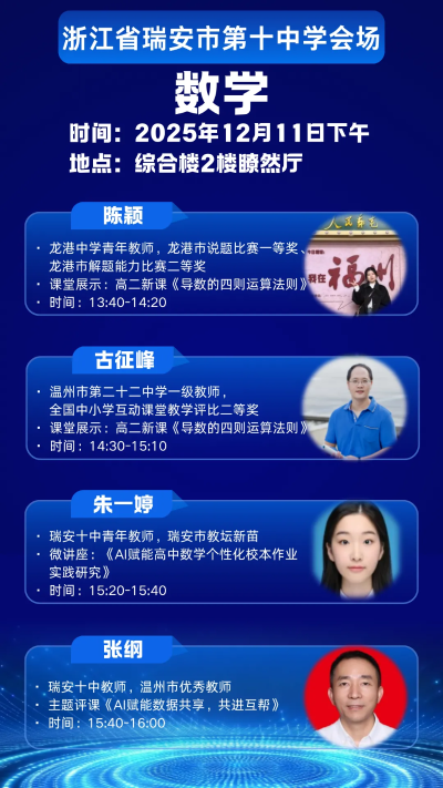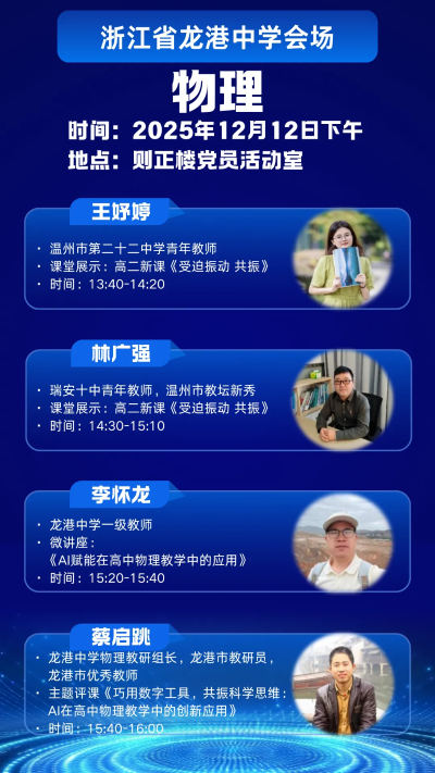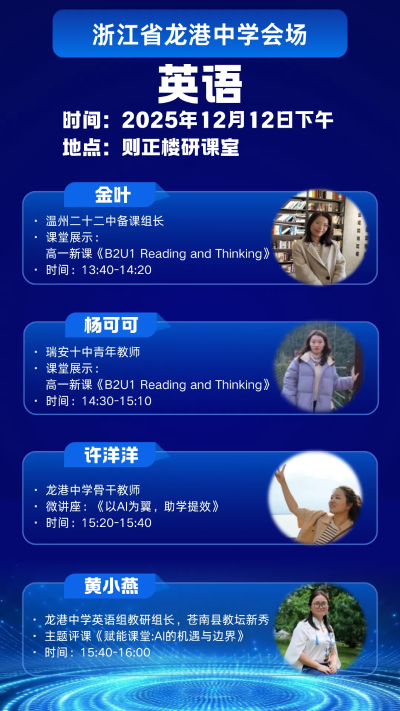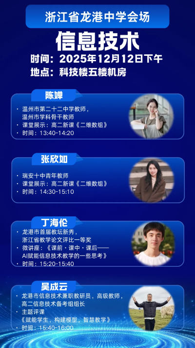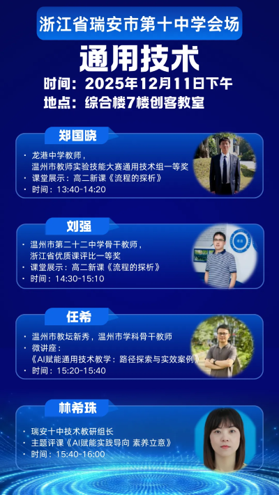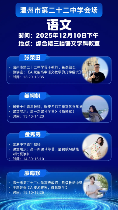 为探索人工智能与教育教学的深度融合路径,切实提升课堂教学实效与教师数字素养,温州市第二十二中学、瑞安市第十中学、龙港中学定于12 月 10 日 — 12 日联合举办 “AI 赋能教学” 主题研修活动。