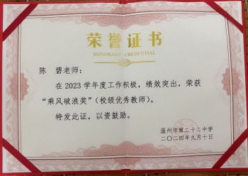 她虽然荣获过诸多荣誉,教育教学工作得到高度认可,教育理念和育人方式得到肯定,但她深知教育之路永无止境,16年教龄的她仍积极参与市里的命题竞赛、论文和课题比赛等活动,教学中的困惑通过教研来解答,教研上的思考成果又反过来助力自己的日常教学。心怀谦卑与进取之心,努力提升自己的专业素养,以此给予学生更有质量而长情的陪伴。