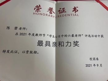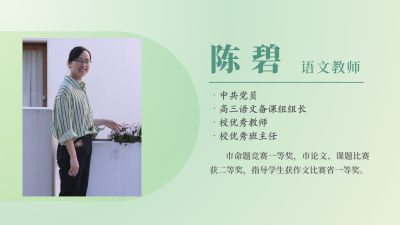 “教育的本质意味着,一棵树摇动另一棵树,一朵云推动另一朵云,一个灵魂唤醒另一个灵魂。”这是陈碧老师恪守的教育执念,带给学生的感受是“如一阵清风温柔拂面,顺学生的人生之船以正道”。