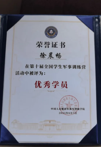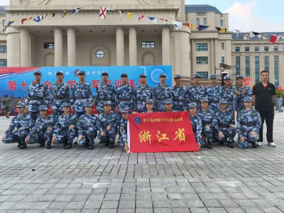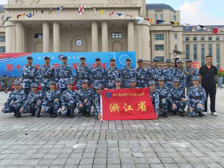 7 月 25 日至 8 月 7 日,第十届全国军事训练营在青岛拉开战幕。代表浙江省出征的赵昱朝、徐晨畅、陈孝钧 3 位同学,在高手云集的水上障碍科目中沉着应战、默契配合,从全国 32 支队伍中突围,斩获全国三等奖。值得一提的是,徐晨畅同学凭借卓越的军事技能、过硬的心理素质和强烈的集体荣誉感,在众多选手中脱颖而出,荣获全国 “优秀学员”称号。