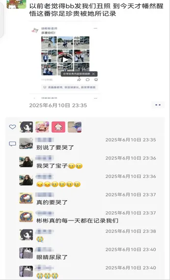 彬彬是全段最不像班主任的班主任,总是带着点孩子气的感性,遇到煽情的时刻,眼眶比我们红得还快。她总爱举着手机,偷偷记录我们的“黑历史”——早读时睡眼惺忪的呆样、运动会上狂奔到表情失控的瞬间、课间打闹时笑到变形的脸......我们一边嫌弃地喊着“老师你下次别拍了”,而她也总是嘿嘿一笑依旧记录,我们却又在毕业后翻着这些照片,突然湿了眼眶——原来最珍贵的青春,都被你悄悄存进了相册里;你很少说大道理,却用最细腻的陪伴告诉我们什么是成长;你是在用最温柔的方式,让我们学会独立飞翔。毕业后的某天,当记忆开始泛黄,我们一定会想起——那个爱哭又爱笑的你,那个最懂我们的你。